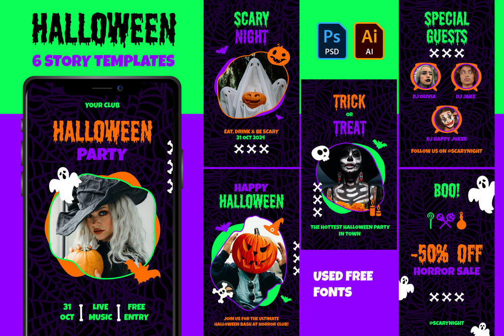Neon Halloween Story Templates contain 6 Instagram stories in cartoon scary style with skull, pumpkin, ghost, bat, witch hat, bones. Halloween party promotion vertical vector graphic layout template with typography for advert, discotheque, music concert, advertisement, live event, ads. Autumn event gothic invitation with space for text with promotion design. Trick or treat. 31th October night. Stylish trendy advertising template for seasonal event.