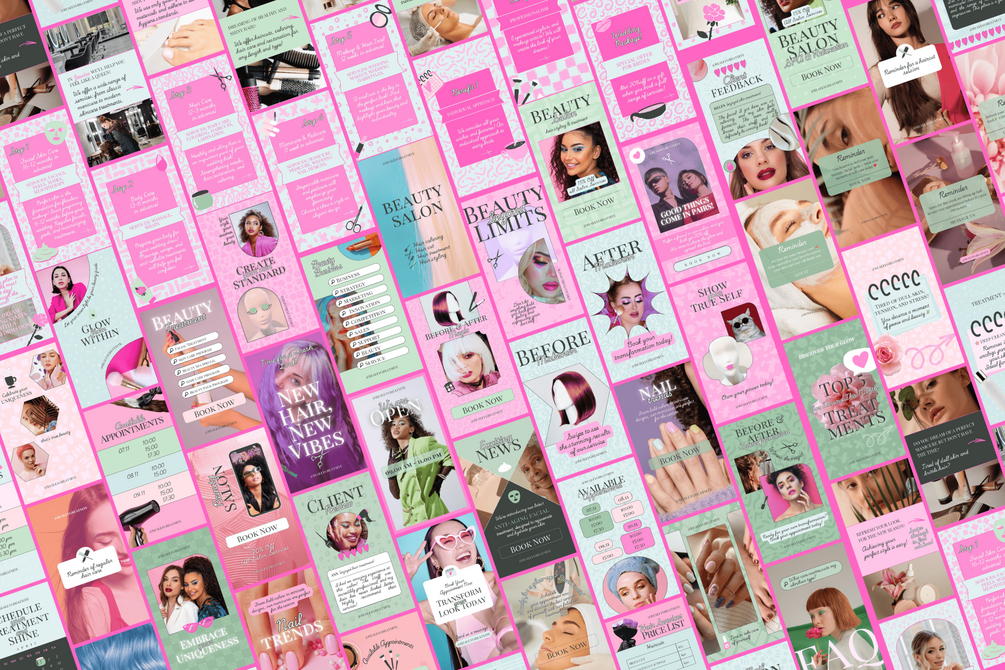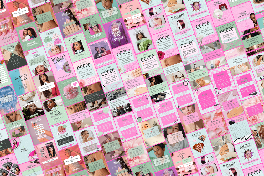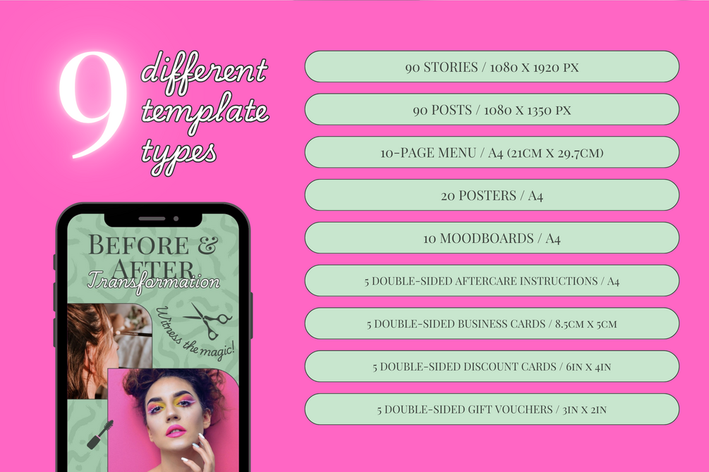 All-in-one bundle includes 260 Canva templates for Instagram Stories and Posts, a printable A4 service menu, aftercare instructions, posters, moodboards, business cards, gift vouchers, and discount cards – everything you need to attract, impress, and retain your clients.