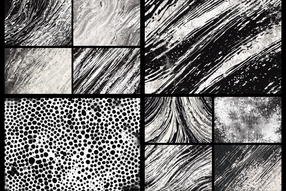 Black Grunge Halftone Distressed Abstract Textures Pack contains 10 textured spotty gray stone wall or old paper with spots from brush backdrops with retro vintage nostalgia effect: